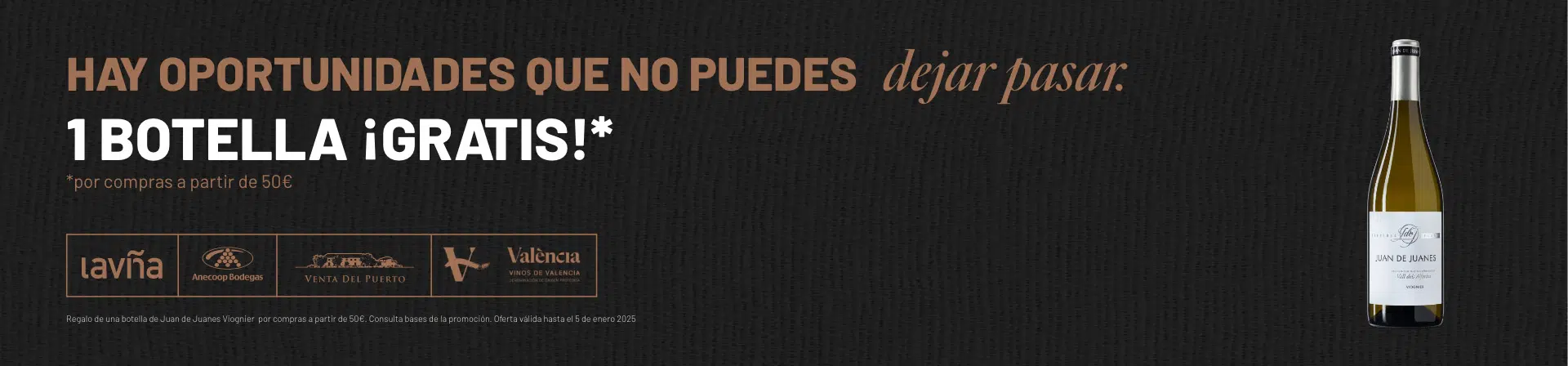 Regalo de una botella de Juan de Juanes Viognier por compras a partir de 50€. Consulta bases de la promoción. Oferta válida hasta el 5 de enero de 2025.